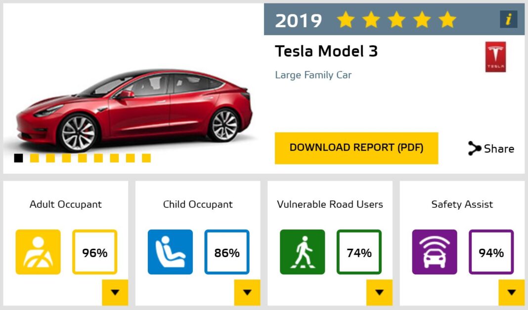 Неколку месеци после дебито на европскиот пазар Tesla Model 3 стана најбезбедниот автомобил, кој бил тестиран од независната организација Euro NCAP. Американскиот електромобил постави апсолутен рекорд за тестирње, добивајќи рејтинг од 94% за работата на системите за активна безбедност. Претходно највисокиот резултат беше на Citroen C5 Aircross со 82%.