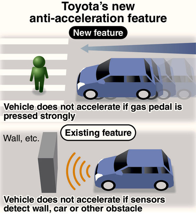Новите системи за Тојота работат со помош на цензори за да ја прочитаат силата на притисокот на педалата на гасот. Ако биде силно притисната возилото нема веднаш да тргне. Тоа значи дека во ситуација ако треба да сопрете, а вие наместо тоа стиснеме на гаста возилото нема да забрза. Според сегашните системи, возилото не забрзува ако сензорите прочитаат присуство на ѕид, возило или друга пречка.