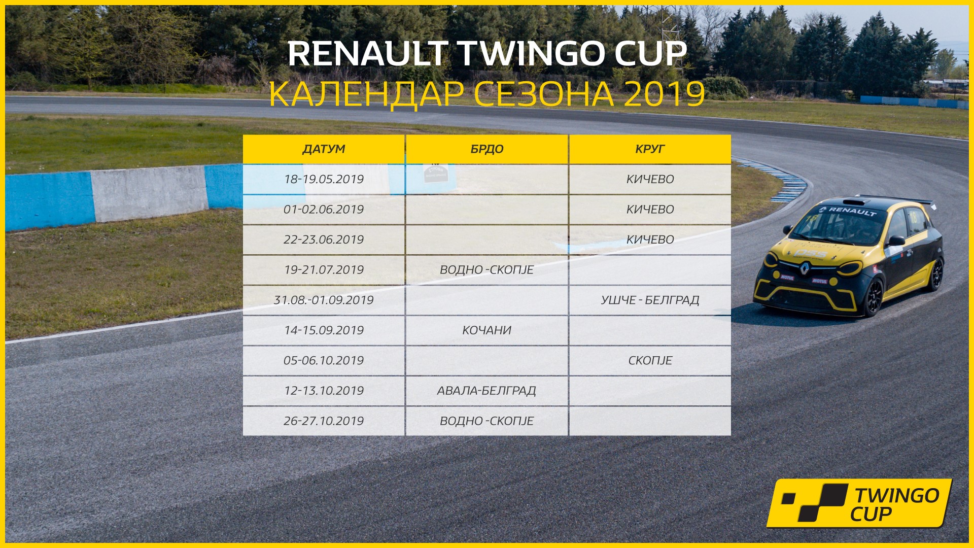Сезоната во Twingo Cup почнува на 18-19 мај со крижна трка во Кичево. Планирани се пет кружни трки, од што една ќе се вози на Ушќе во Белград. Ќе има и четири ридски трки, почнувајќи од 21 јули во Скопје, и тука исто така ќе се вози трка на Авала кај Белград.