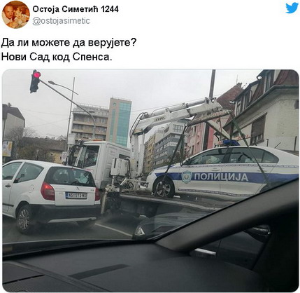 На Twitter се врти фотографија снимена во Нови Сад, во близина на Спенс центарот на која се гледа како пајак возило носи полициско возило на српското МВР.