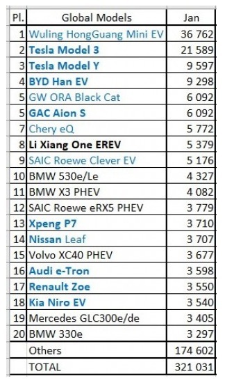 Најпродаваниот електричен автомобил во светот во јануари беше целосно електричниот Wuling Mini со резултат од речиси 37.000 примероци. На 2. и 3. место се наоѓаат претствници на Tesla- Model 3 со 21.589 примероци и Model Y со 9.597.