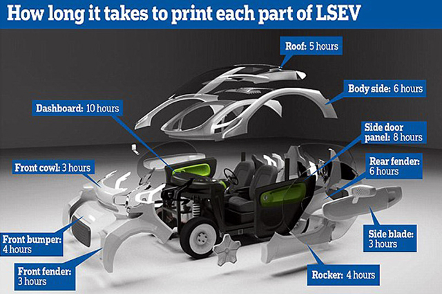 Секој LSEV може да биде испечатен за околу три дена. Технологијата за тродимензионален печат им дозволува на конструкторите да го намалат бројот на деталите од кои се изработува електромобилот и тоа до 40-60 место 2.000 колку што е вообичаено за обично лесно возило.