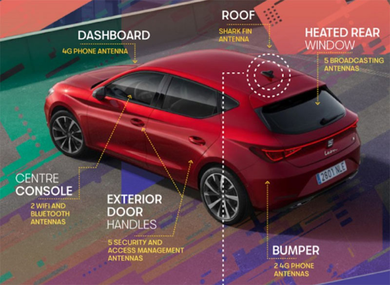 Како најдобра локација за интегрирањето на антените за основни функционалности како GPS, 4G, WiFi и други, SEAT, а и автомобилските производители, го избираат таканаречениот елемент (shark-fin) во задниот дел на таванот.