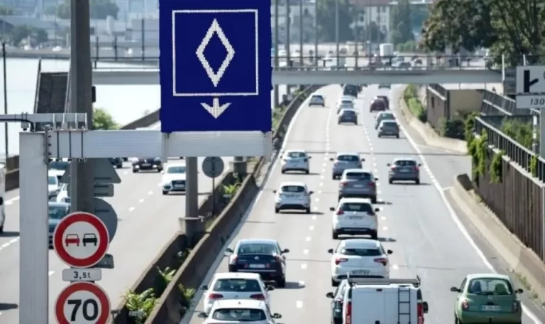 Сообраќајната лента означена со ромб е претежно од левата страна. Досега знакот постоеше само во Франција, тестиран од 2020 година во Лион, Гренобл и Стразбур. Ромбот означува (понекогаш придружен со дополнителна стрелка за објаснување) лентата за јавен превоз, такси, возила во кои има најмалку две лица, вклучувајќи го и возачот. Ова е практично т.н заедничка употреба.